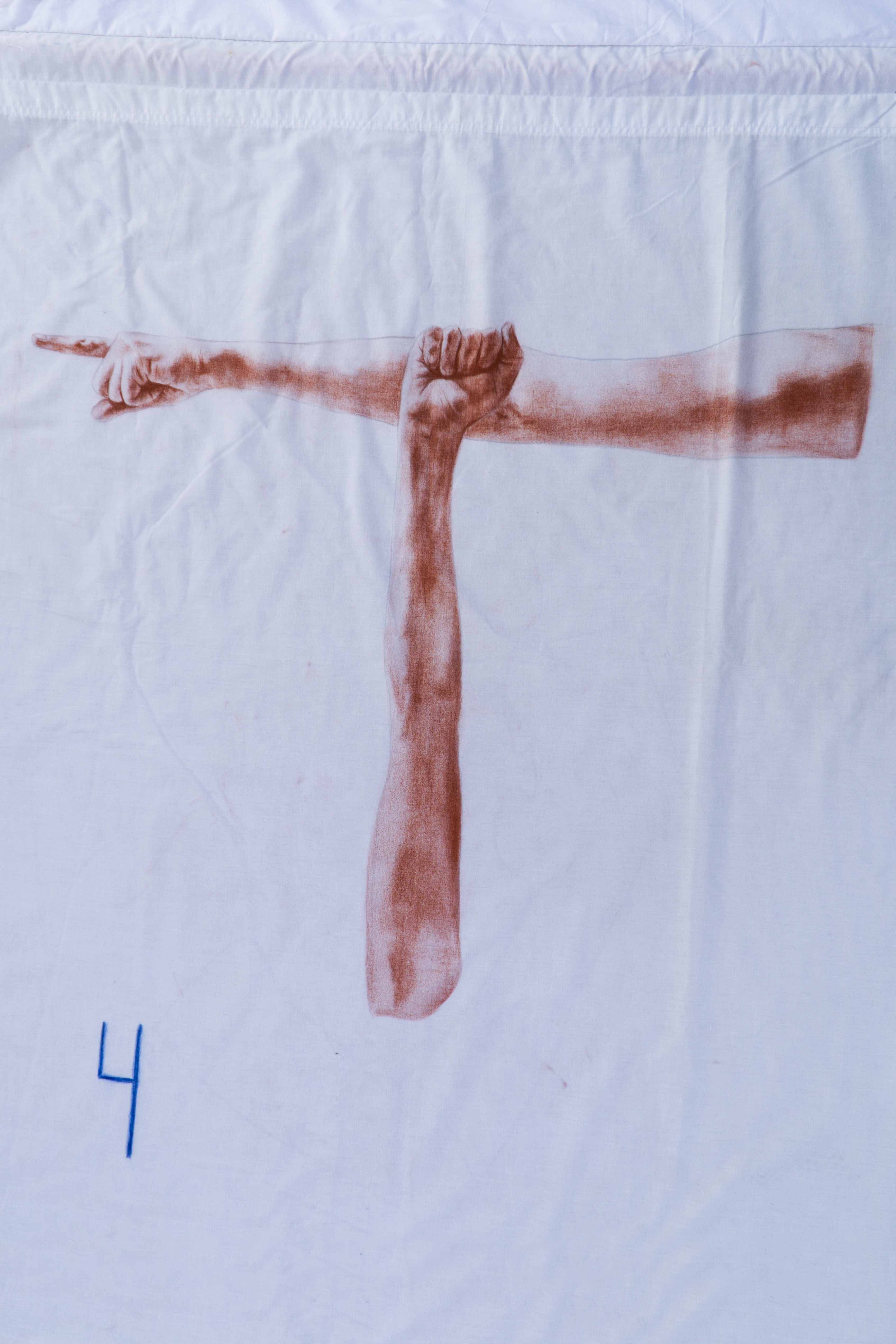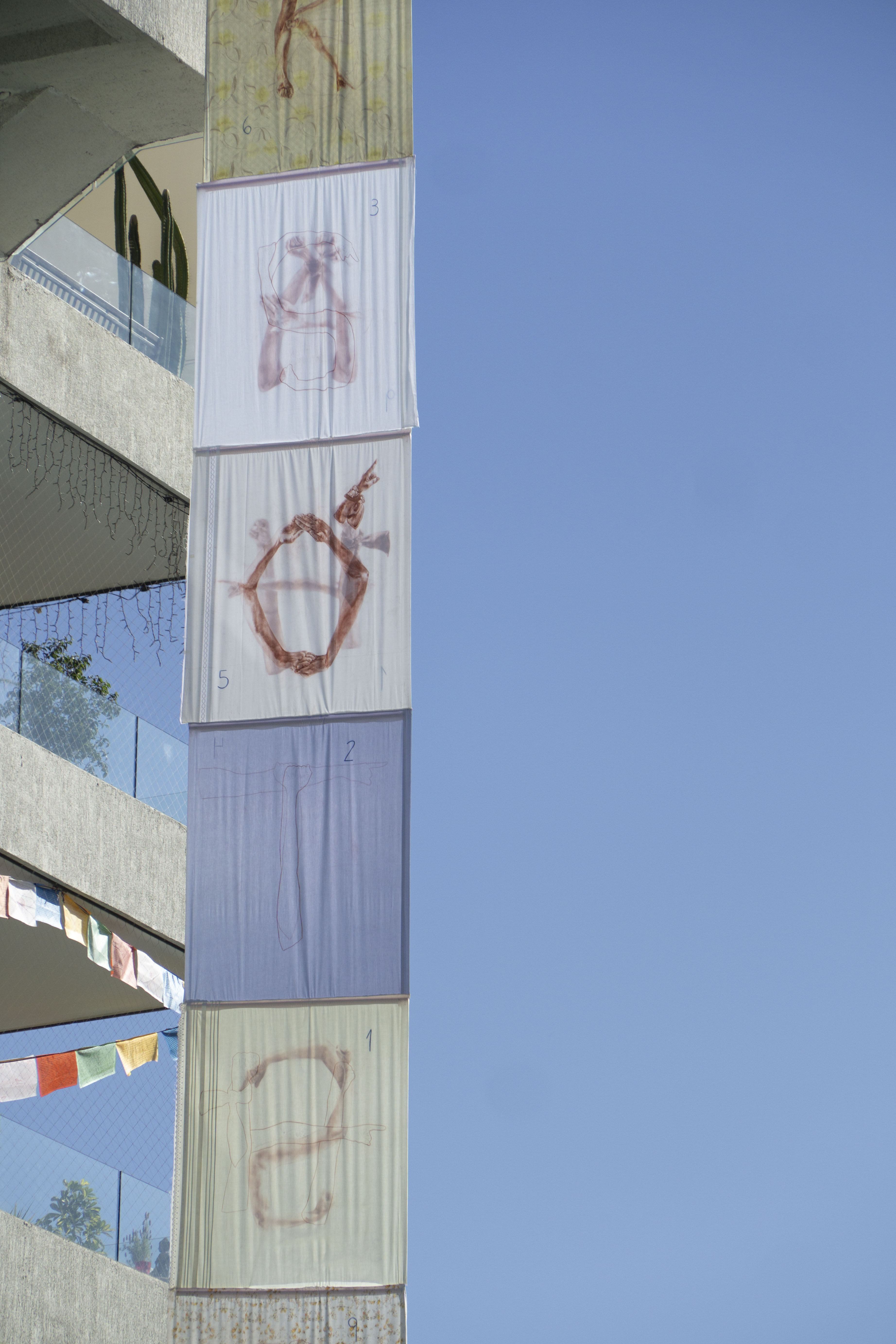“Pienso en la memoria como único espacio público permanente en el cuerpo, e inmediatamente me transporto dos meses atrás, al reciente y magnífico 8M que pudimos compartir al aire, libre. Nuestro último encuentro/recuerdo físico/corporal/colectivo en la calle antes de entrar en cuarentena preventiva. Un simple juego de letras. Un memorice vertical que contiene -en desorden- la palabra HISTÓRICAS1. Colgué desde el último piso del edificio 10 sábanas unidas -las cuales fueron donadas por diferentes personas para la realización de esta obra-, donde cada módulo contenía una letra hecha con brazos dibujados en sanguina por cara.“