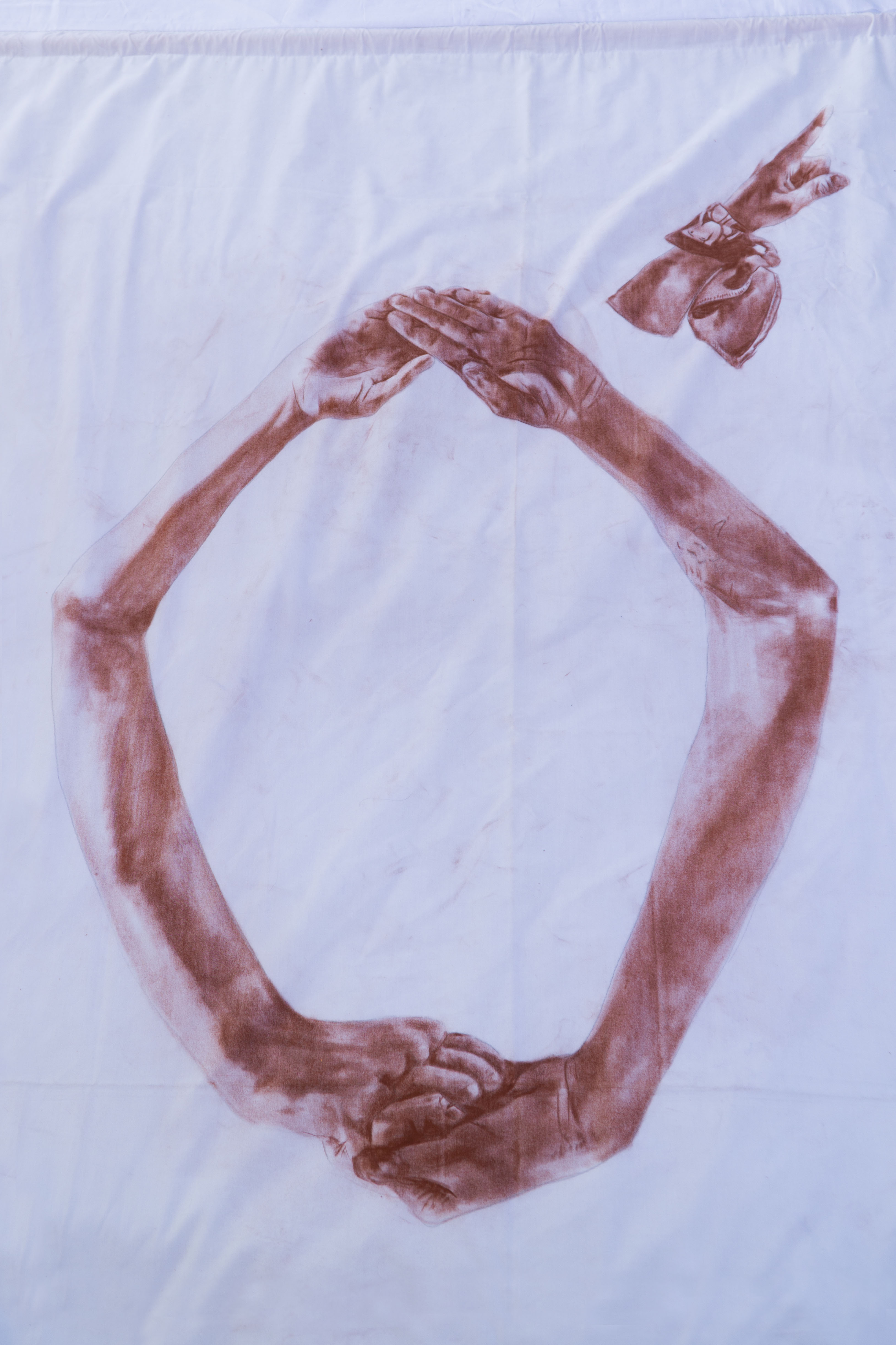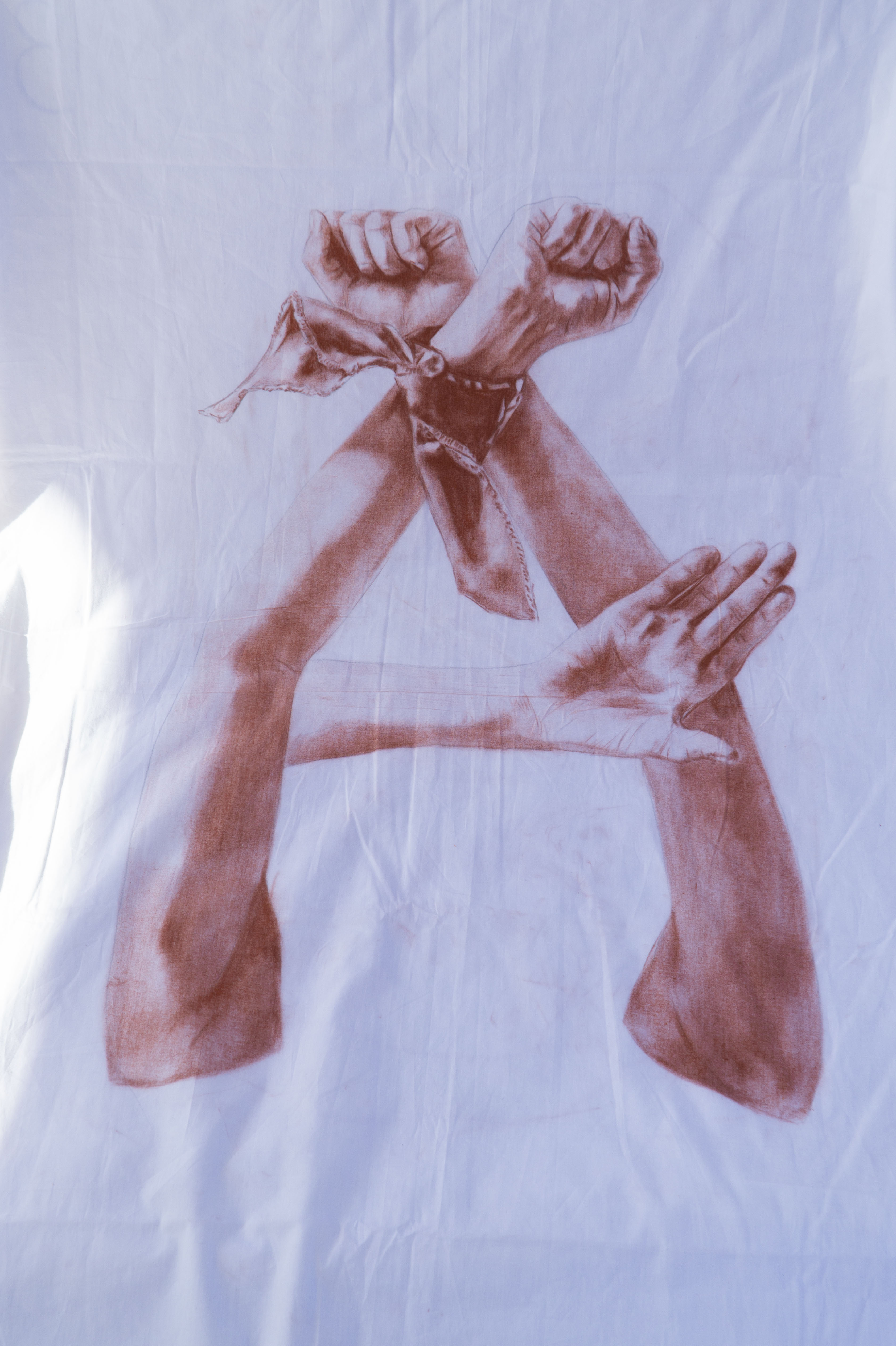 2020. Memorice Vertical, instalación, dibujo en sanguina sobre sábanas donadas, 17 x 1,10 m aprox.